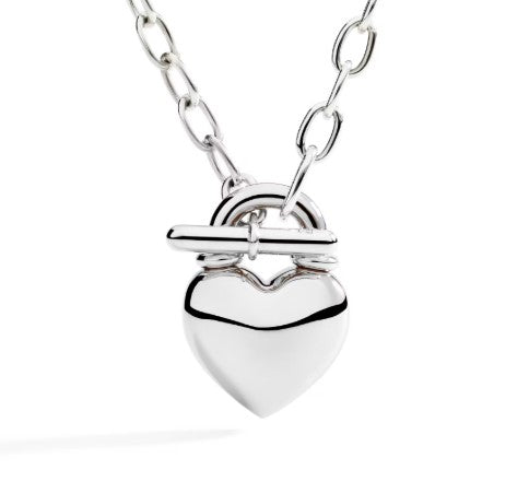 Collana elegante con ciondolo a forma di cuore bold in argento, caratterizzata dalla celebre chiusura T-bar che garantisce sicurezza e stile. Il design minimalista e sofisticato si adatta perfettamente a qualsiasi occasione, dal quotidiano agli eventi speciali.