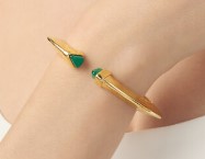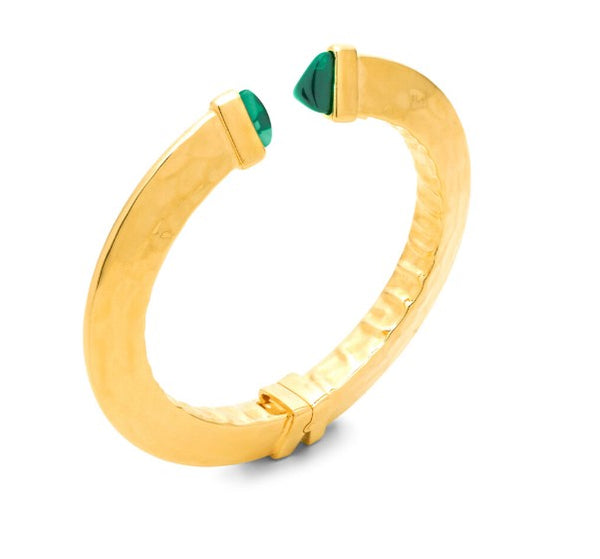 Un elegante bangle in argento dorato che si distingue per il sapiente equilibrio di volumi, riflessi e il contrasto cromatico dei cristalli verdi posti alle due estremità. Il bracciale è realizzato con una lastra d'argento, martellata e successivamente piegata a mano. Ideale da indossare abbinato ad altri bangle di diverse dimensioni, rappresenta un accessorio versatile e dallo stile inconfondibile.