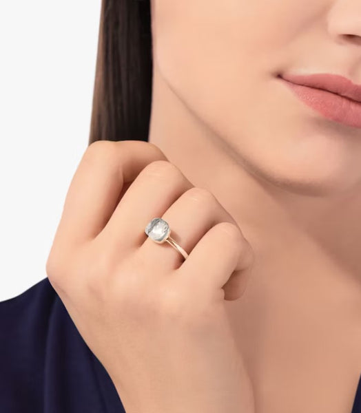 Anello Nudo in oro rosa con castone in oro bianco e topazio bianco sfaccettato.